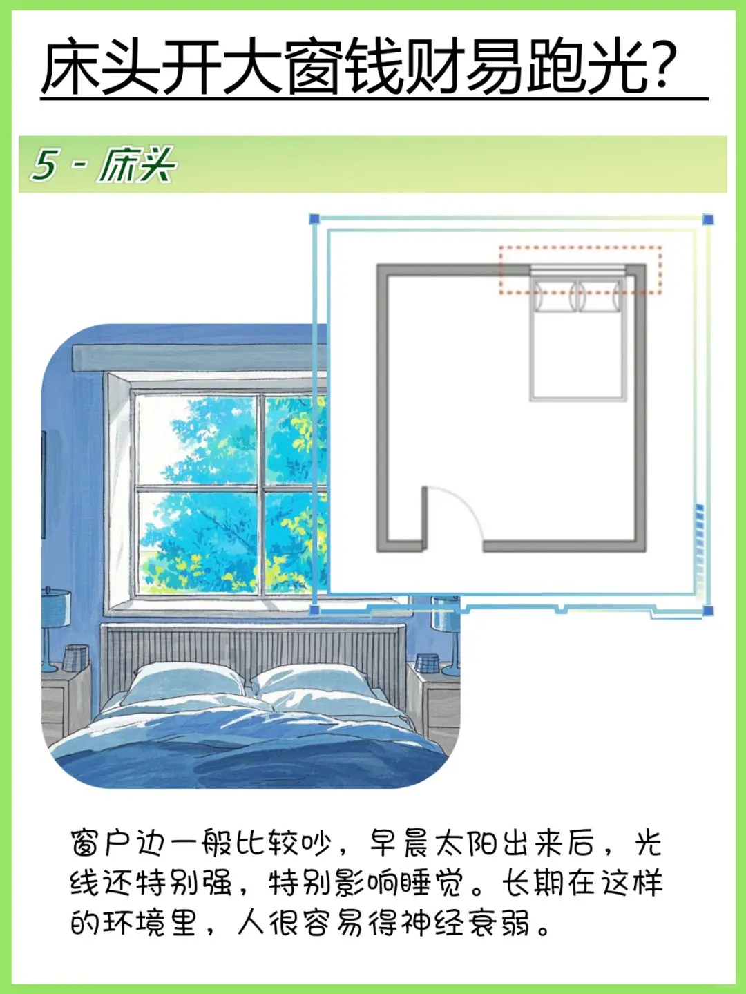 5️⃣床头不要对着窗户 床头开大窗,钱财易跑光。靠近窗户的地方不仅声音嘈杂,早上日出后太阳光容易扰乱睡眠品质,久而久之影响人的身体健康,容易神经衰弱。