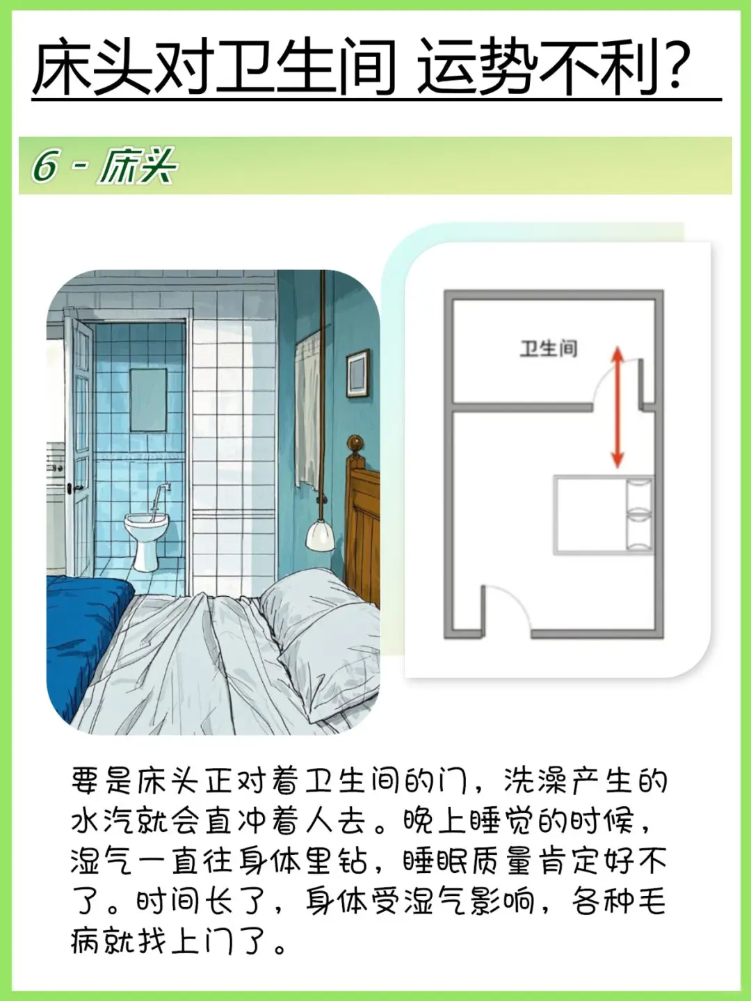 6️⃣床头不要对着卫生间 床头对着卫生间会耗气耗材,对健康运势不利。卫生间水气湿气重,床头对着卫生间的门容易让这些水气湿气进入人的身体,影响睡眠质量,时间长了容易得病。