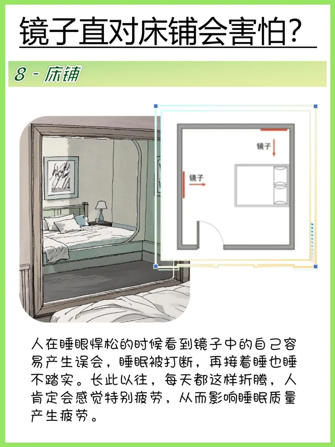 8️⃣镜子不要对着床 镜子直对床铺会有鬼魅之情形。人在睡眼惺忪的时候看到镜子中的自己容易产生误会,从而影响睡眠质量,产生疲劳。