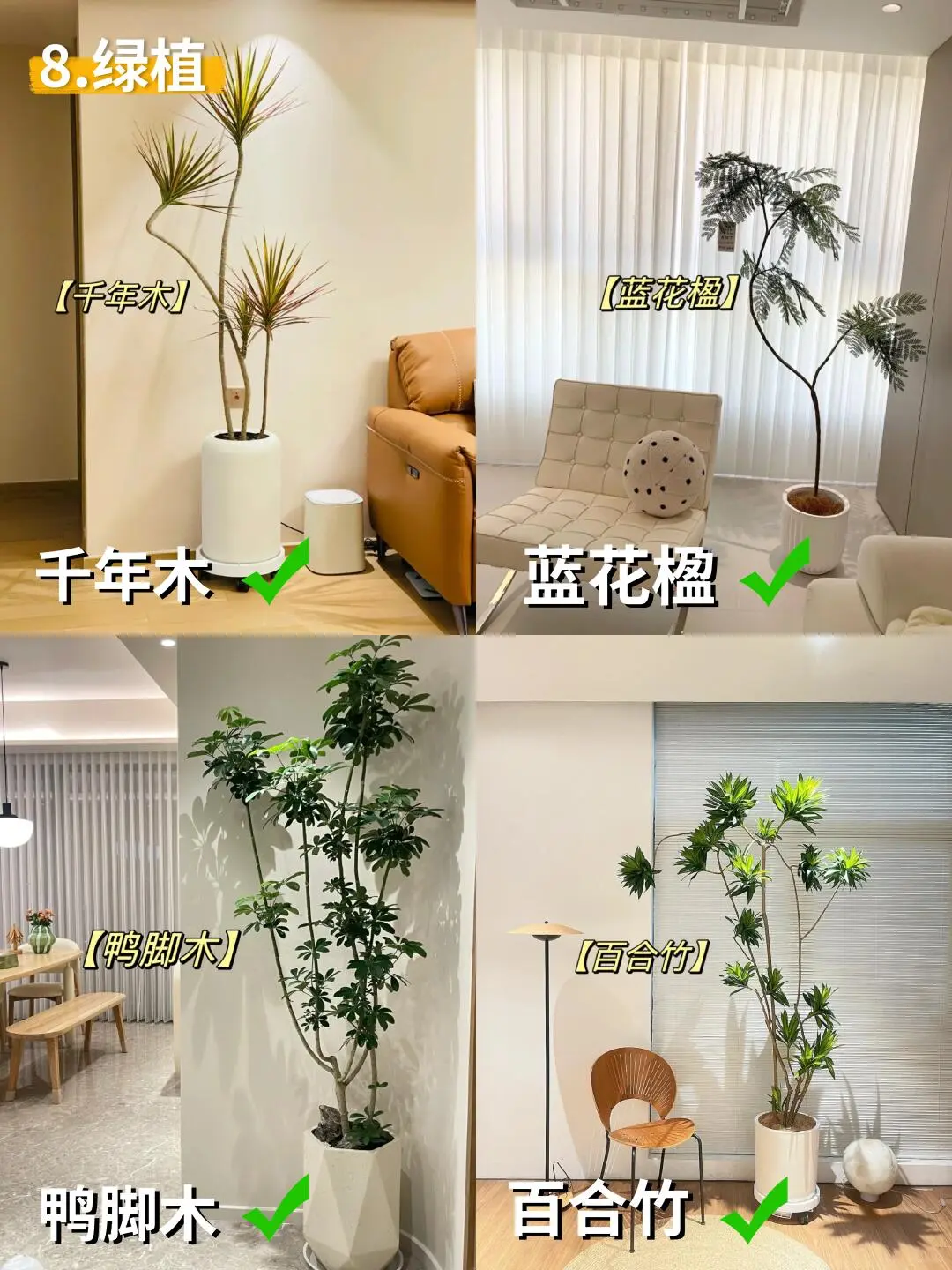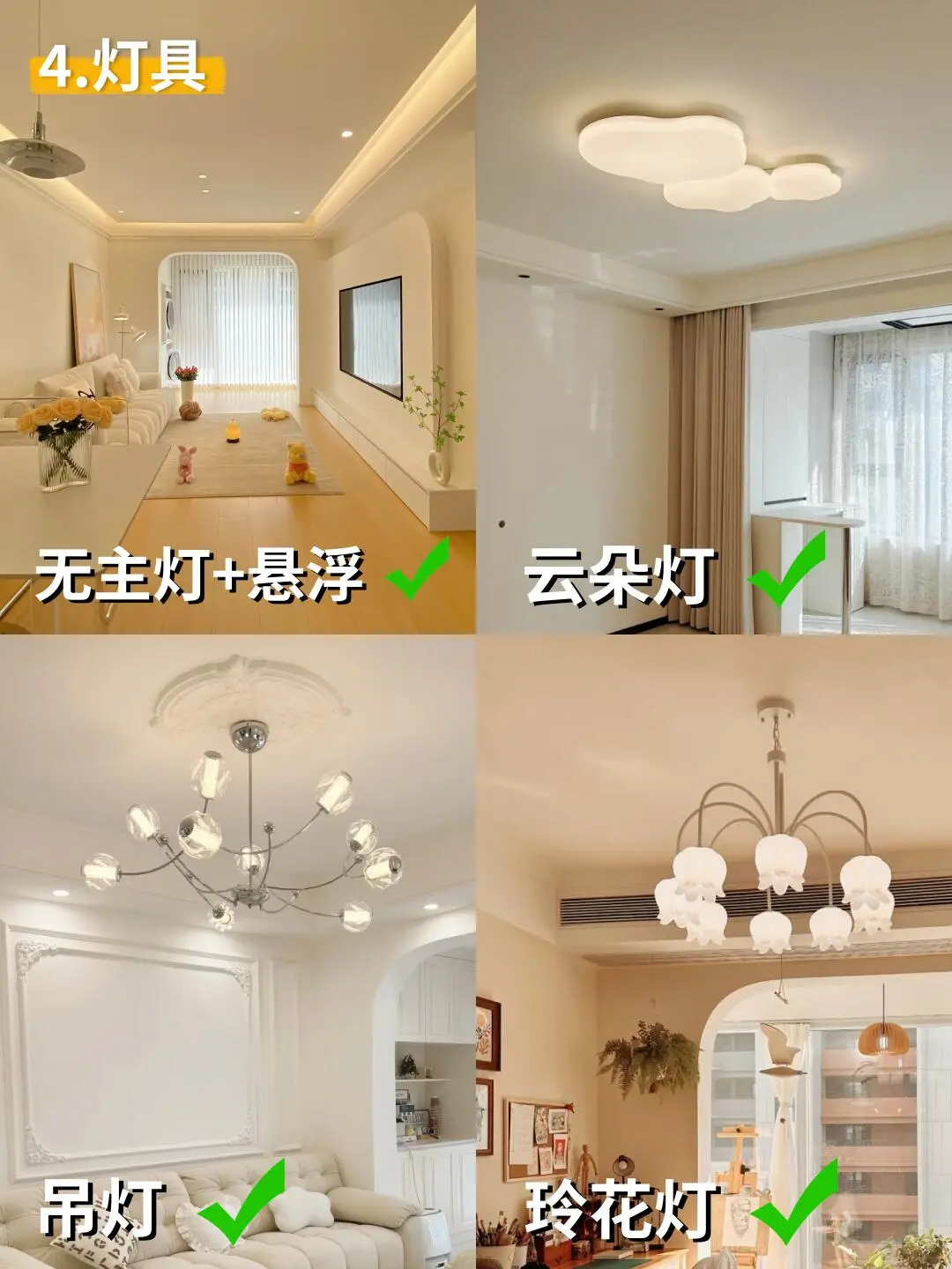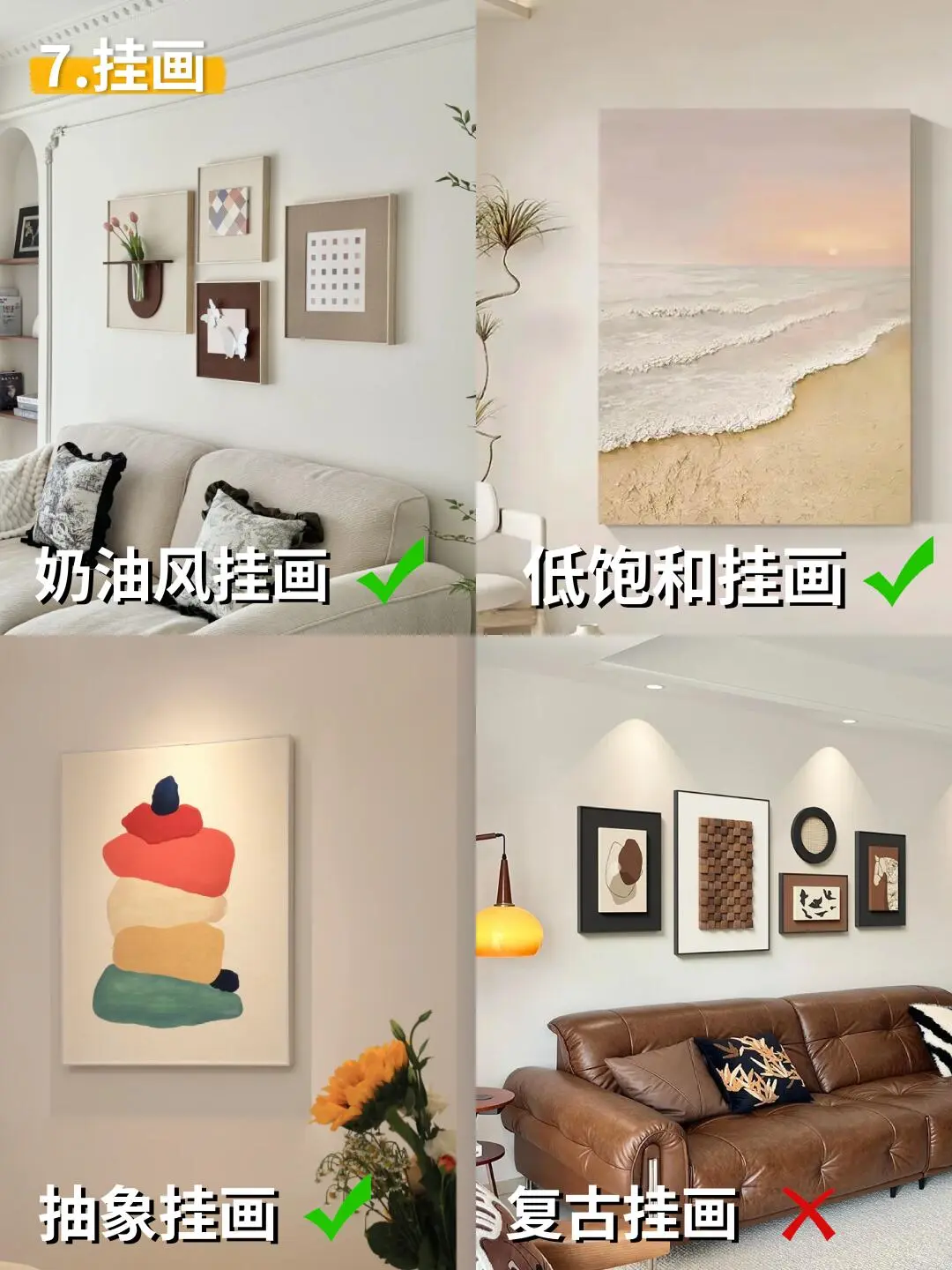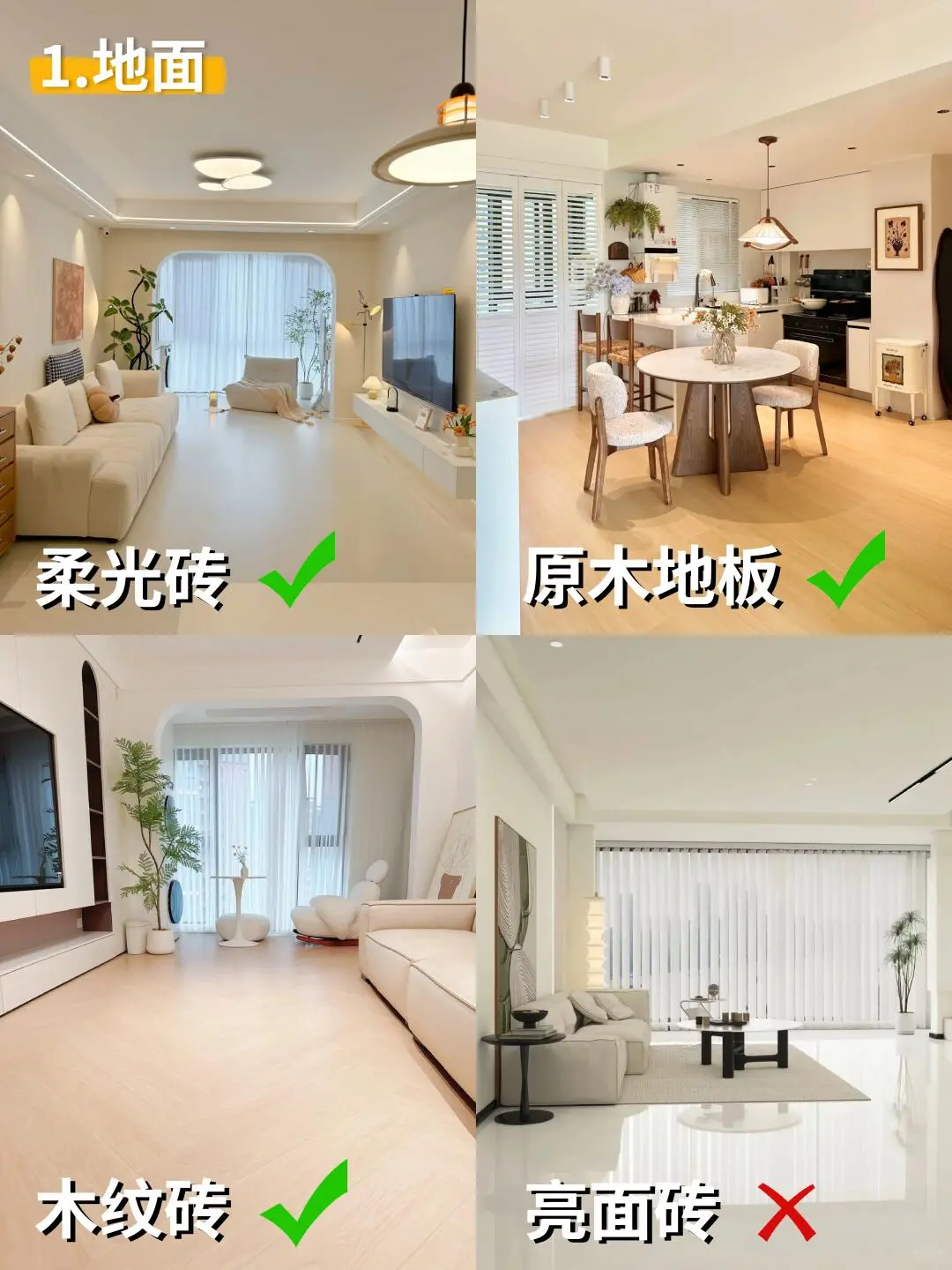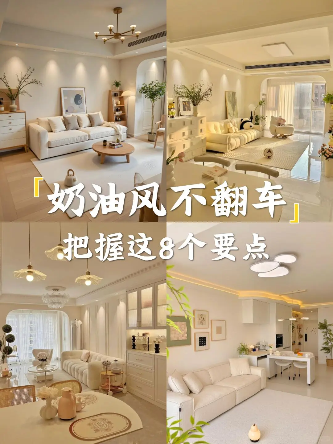 奶油风装不好秒变出租房画风 今天咱们来细抠每个环节 让“高级感”从细节里自然流露! 1⃣ 地面——亮面砖请直接放弃! × 踩坑典型:冷灰亮面砖,反光冰冷,奶油感全无 正确思路:柔光砖或木地板+相近色美缝 记住:木地板选浅橡木色,瓷砖挑奶白/米黄哑光款 2⃣ 墙面——别刷冷白! × 翻车现场:冷白墙+白光=诊所体验 升级方案:珍珠白/乳白漆+木质元素点缀 搭配比例:墙面60%留白,木格栅占20%左右 3⃣ 灯光——吸顶灯真的达咩! × 灾难现场:平板灯一开,温馨感全无 氛围配置:双眼皮吊顶+点状射灯+落地灯 色温口诀:3000K氛围光+3500K辅助光+4000K功能光 4⃣ 柜体——冷白柜门太减分! × 廉价感来源:冷白柜体+黑色拉手 质感秘诀:暖白哑光门板+隐藏式反弹器 注意:收边条颜色要统一,见光板不能省! 5⃣ 沙发——别选科技布! × 保养难题:浅色科技布容易留痕显旧 优选材质:羊羔绒/磨砂皮+可替换沙发套 尺寸参考:小客厅选2.6米直排+休闲椅 6⃣ 窗帘——单层纱不够用! × 隐私困扰:只有金刚纱,傍晚变“橱窗” 完美组合:幻影纱+奶油色遮光帘 ️ 细节:预留20cm窗帘盒,做2倍褶皱 7⃣ 装饰画——拒绝套路化! × 违和感来源:程式化三联画 艺术感加持:手作肌理画+原木画框 配色心机:画面带一抹焦糖色或墨绿点缀 8⃣️ 绿植——别选“网红款”! × 拉低颜值:假绿植或出租房标配款 提升格调:蓝花楹/孔雀木+陶土盆 摆放心机:1.5米高绿植放在转角延伸空间 掌握这8个细节关键 轻松打造不翻车的治愈系奶油风!