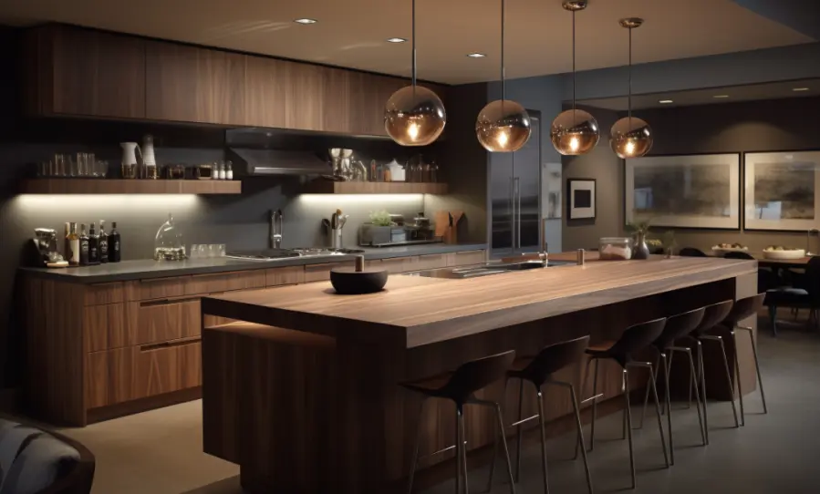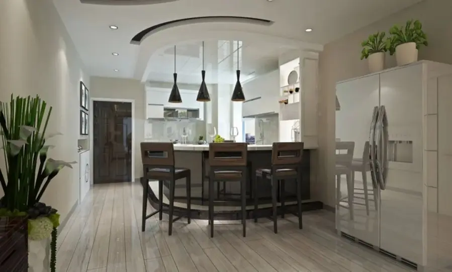 比如厨房橱柜,或者餐桌等家具,就可以在此基础上,与吧台台面进行咬合,形成延伸式吧台现在也有一种新型的吧台,悬空式吧台在中岛台得到基础上延伸一个悬空的台面,从而形成悬空式吧台,这也是延伸式的一种。