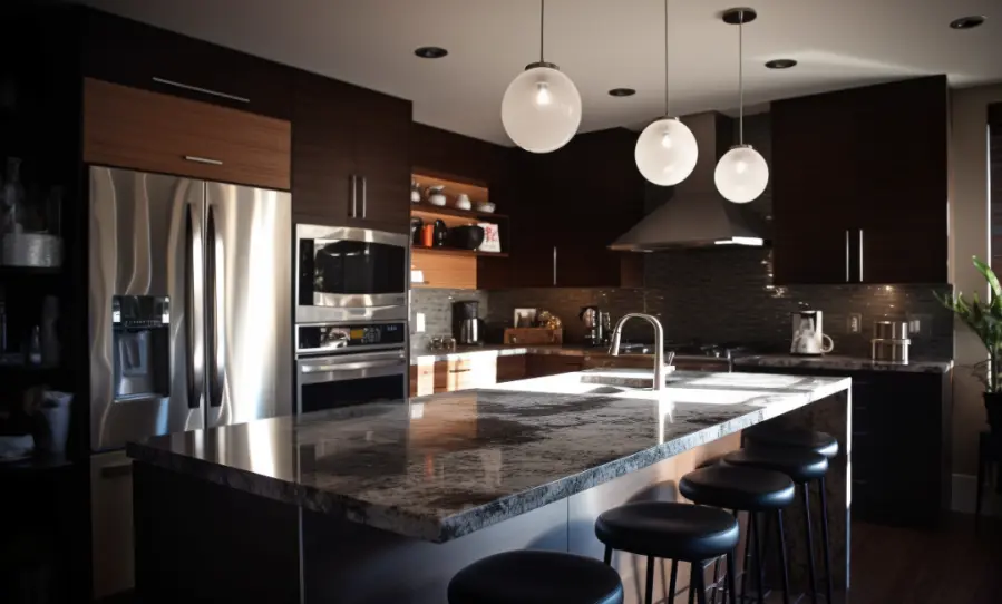 2、大理石一体式吧台,支撑结构与台面均为大理石,一体成形的设计美观流畅。但是没有储物功能,且造价不菲,一般非土豪家庭不会这么做。