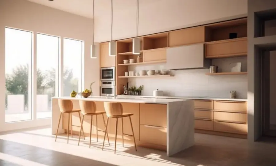 中岛式吧台往往是大户型开放式厨房的标配,位置方面,设计师在设计时要根据厨房格局来设计,结合活动路线让中岛台变成家庭成员互动的中心。
