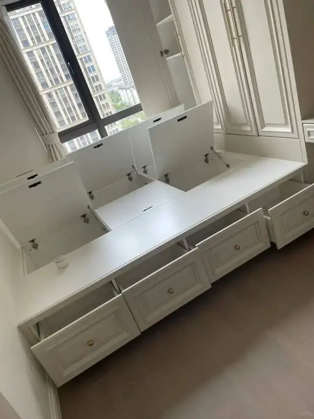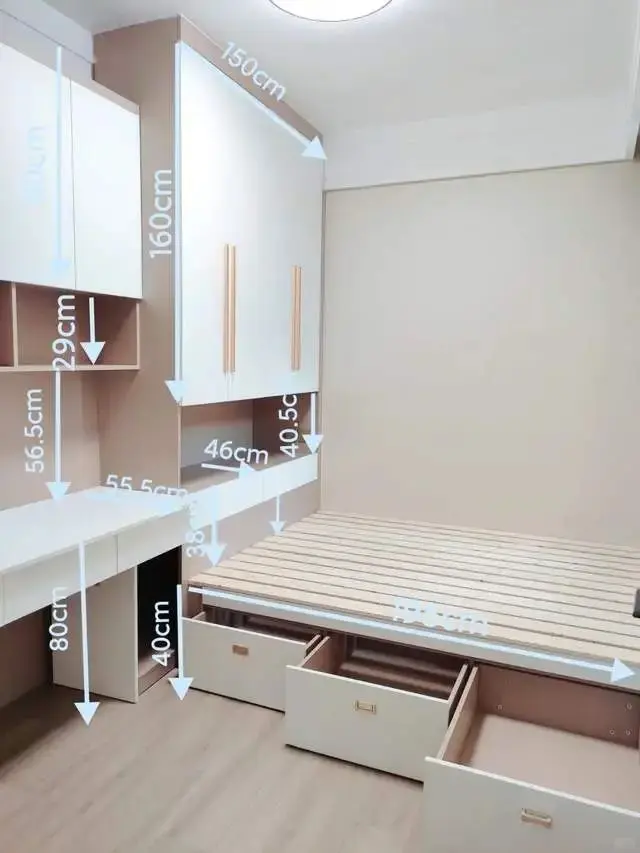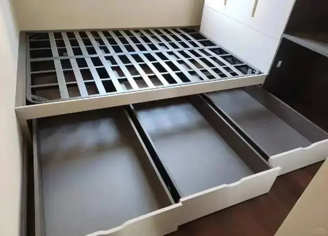 你可以靠外的一段用作抽屉收纳,靠内的柜体做活动床板的收纳。