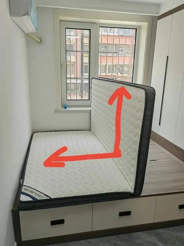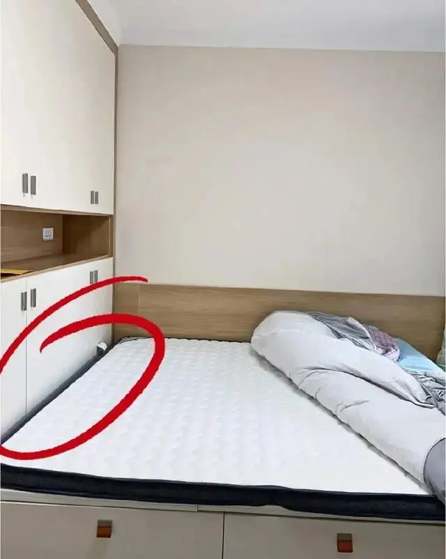 说到这里,有的榻榻米上面会有衣柜,而现在衣柜很多是平开门。所以,我们在设计衣柜时,为了避免柜门打不开的问题,衣柜站脚要根据床垫高度来定。柜子站脚高于床垫厚度,才能保证柜门不被床垫挡到,开不了。