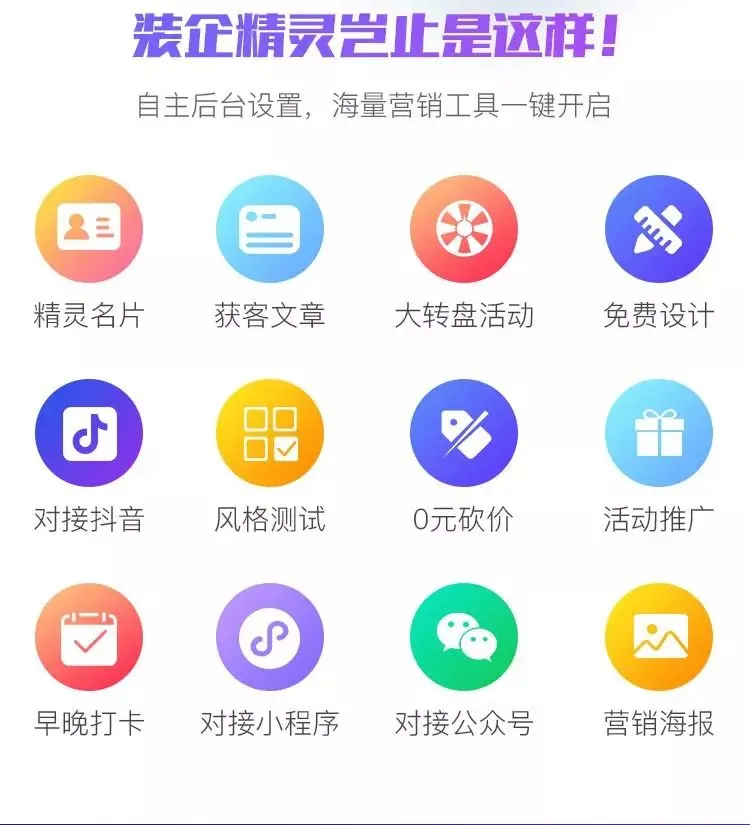 装企营销应用市场:整合装企所需营销工具,自由选择,一键开启,不用到处购买,一个装企精灵就够了。