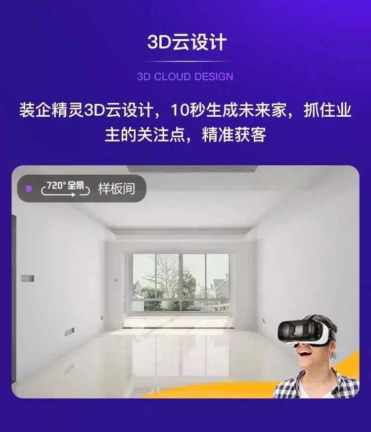 3D云设计营销系统:利用3D概念营销获客,无需做图,海量效果,业内早期提出3D云设计体验未来家的营销落地方法。