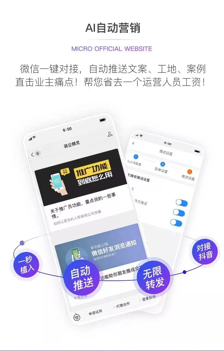 AI自动营销机制:通过打通公众号,自动推送,不限次数,帮助装企用户实现快速激活潜水粉丝的转化效果。