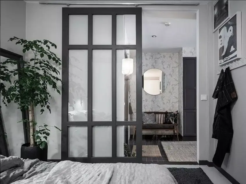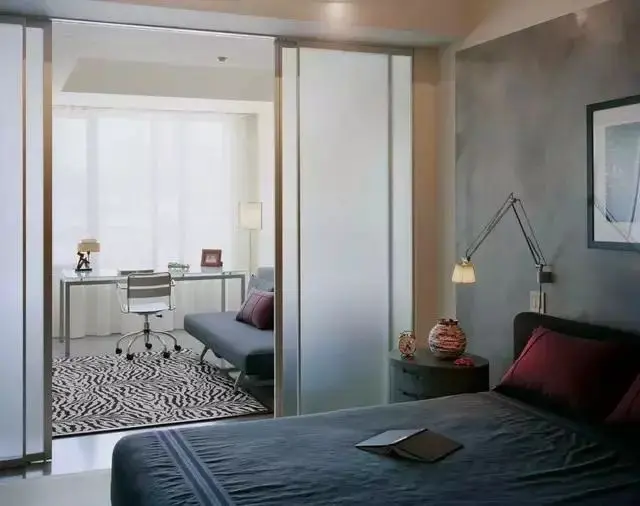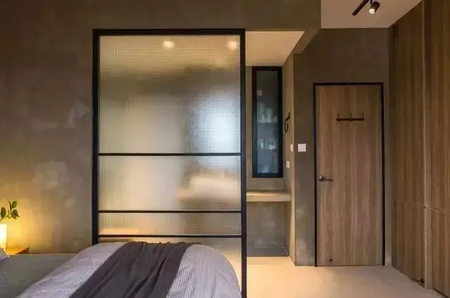 磨砂玻璃的隔断门既保证了卧室的隐秘性,又能兼具采光和通透度,它不需要窗帘遮挡光线,是隔断中比较稳妥的选择。