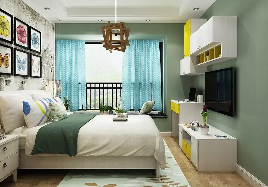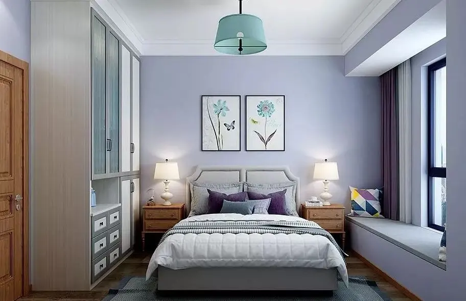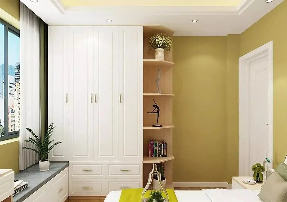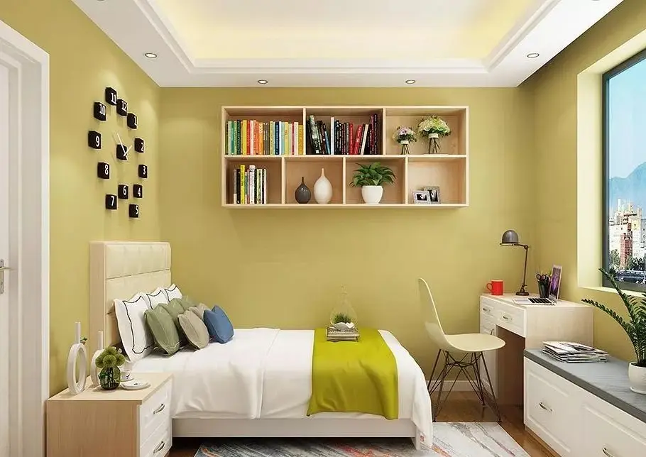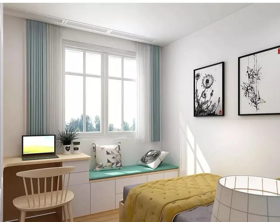 沿着飘窗打造成书桌+书柜+衣柜组合,用1㎡打造一个舒适的空间。